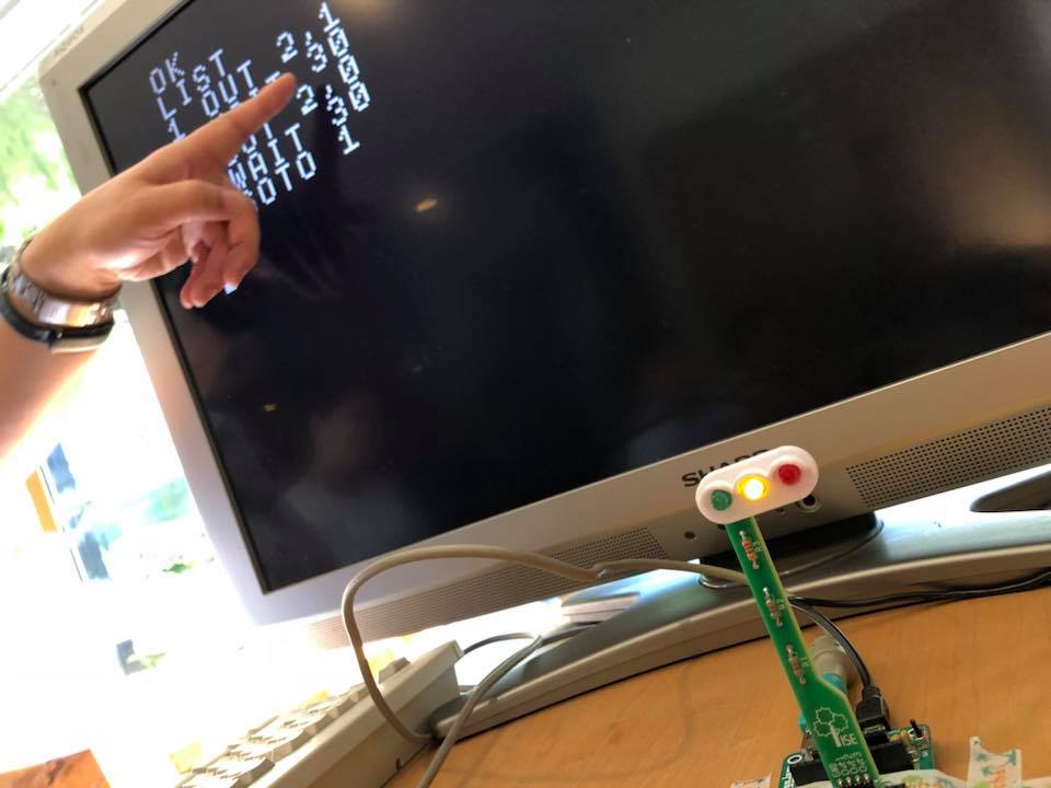 スタッフのキタさん(北原さん)は小さな信号機のプログラミングを実演。
